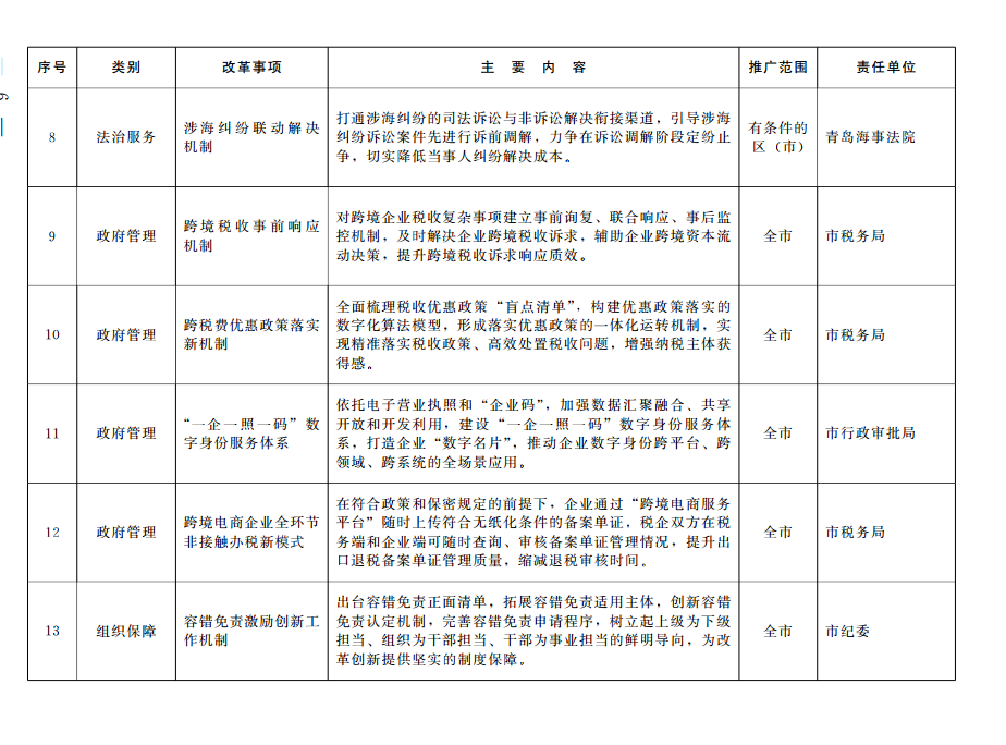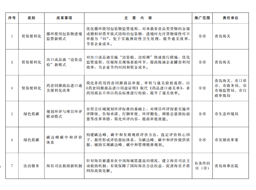 2024年以來,全市各級各部門充分發(fā)揮中國(山東)自由貿(mào)易試驗區(qū)青島片區(qū)(以下簡稱青島自貿(mào)片區(qū))改革開放試驗田作用,堅持以制度創(chuàng)新為核心,大膽試、大膽闖、自主改,全力推進自貿(mào)試驗區(qū)改革創(chuàng)新實踐,形成了新一批制度創(chuàng)新成果。經(jīng)市政府同意,16項制度創(chuàng)新成果在全市推廣?,F(xiàn)就有關(guān)事宜通知如下: